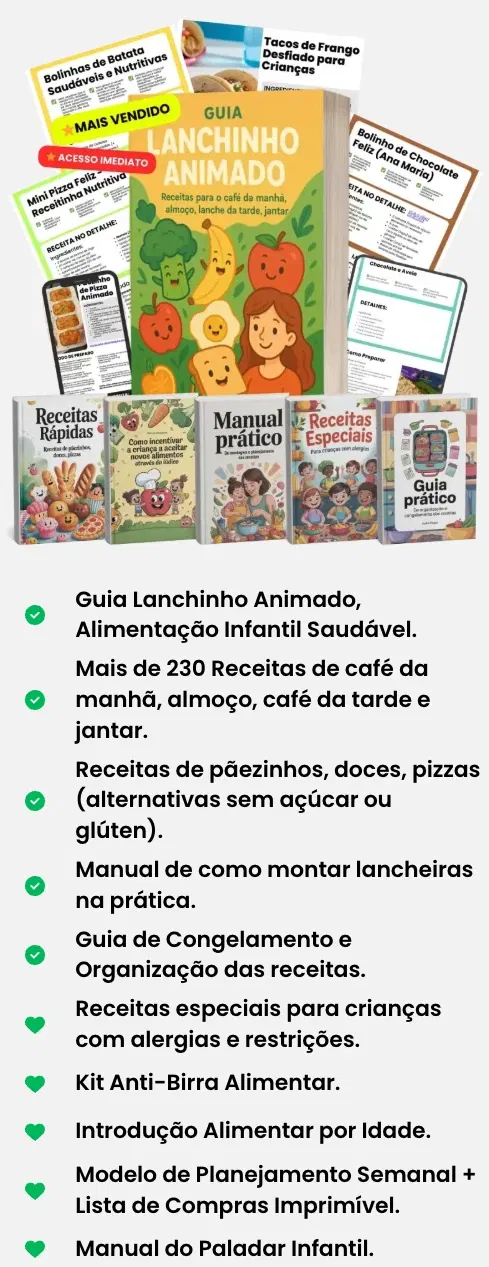 Se te falta criatividade ou tempo pra planejar cardápios, o guia traz receitas organizadas, cardápios completos e até listas de compras prontas.